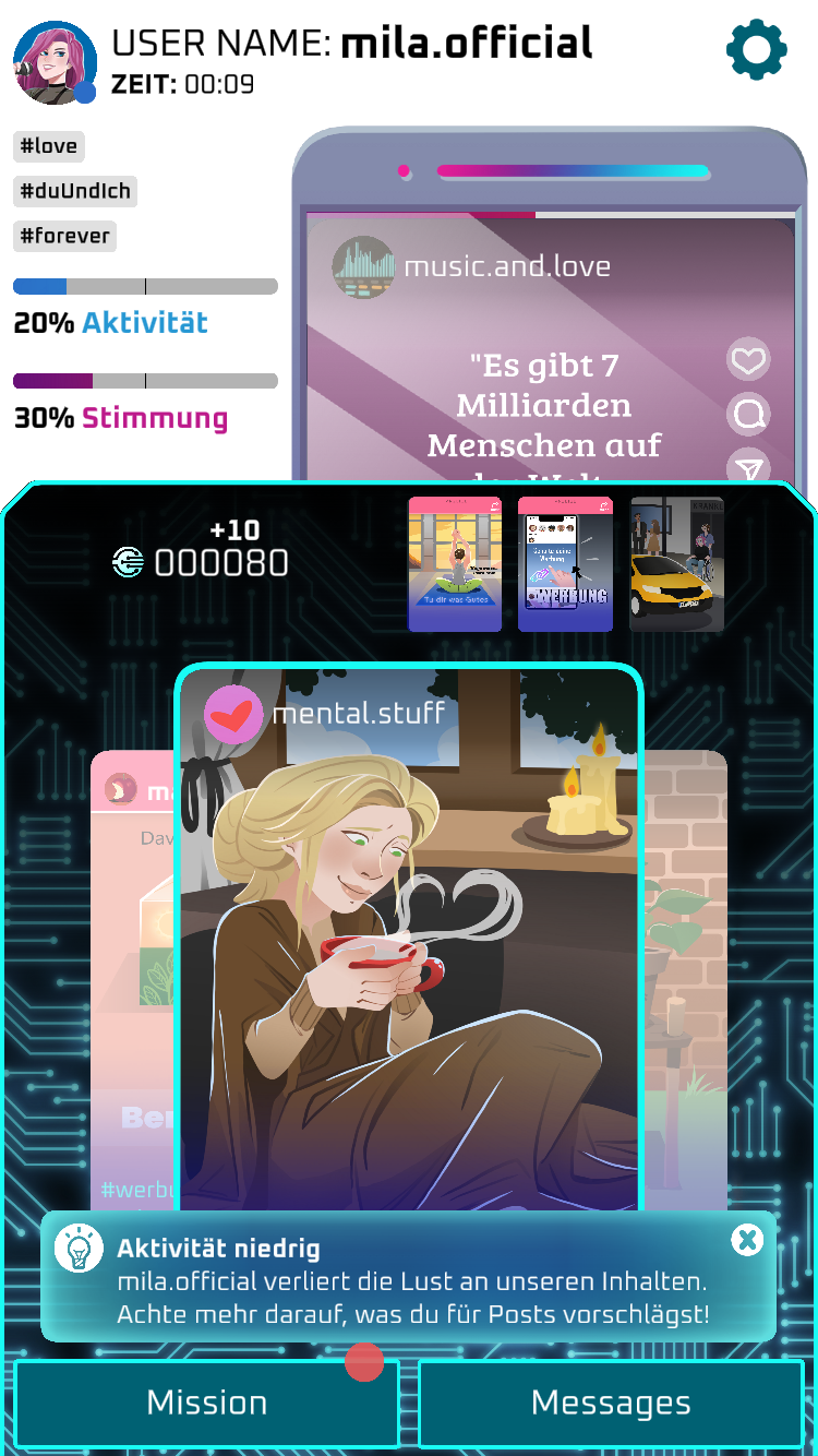 Die Spielenden sollen Informationen sammeln, passende Posts auswählen und gezielt Werbung einblenden, um die Figur auf der Plattform zu halten. Durch passende Inhalte erhalten Spielende Feedback und neue Informationen über die Figur. Ein Kapitel wird erfolgreich abgeschlossen, wenn die Figur für eine bestimmte Zeit online bleibt. Sinkt ihre Aktivität auf null, ist das Ziel verfehlt. Ist die Datensammlung abgeschlossen, wird das nächste Kapitel freigeschaltet. Alle Kapitel können beliebig oft wiederholt werden.